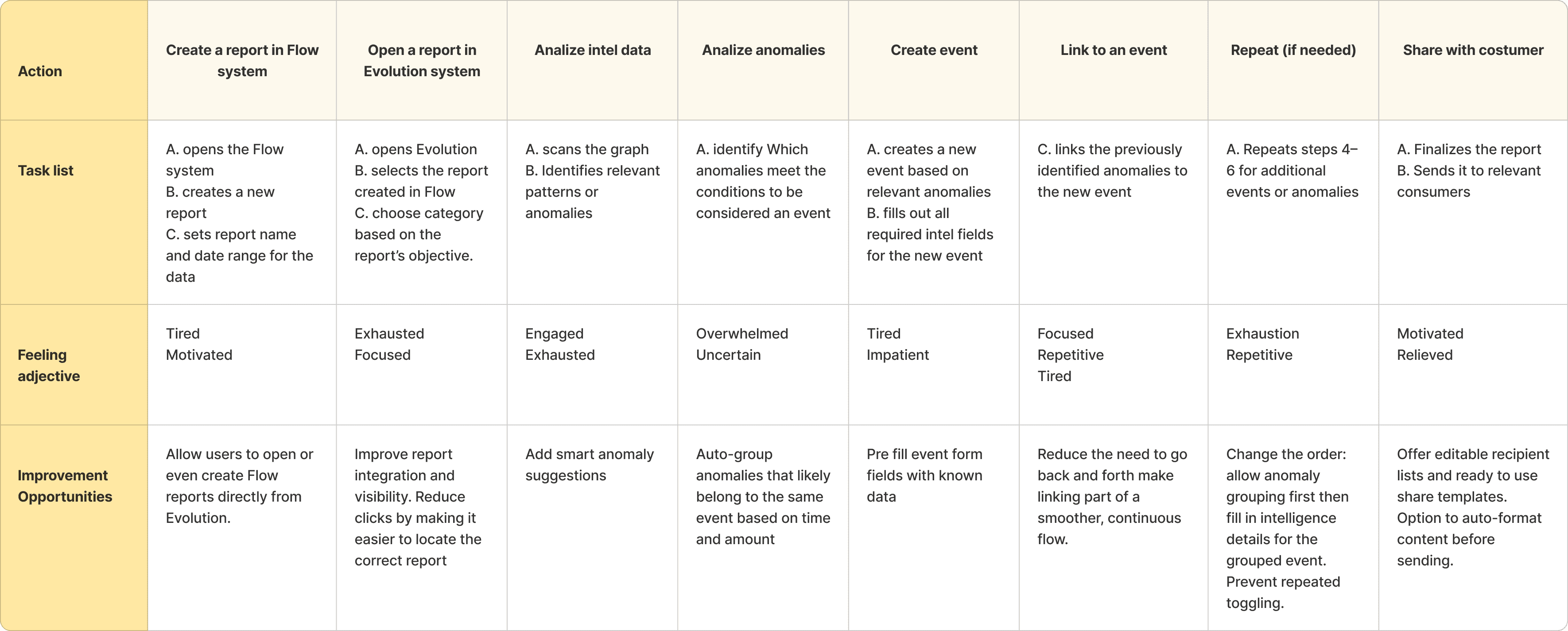 The workflow demanded constant context switching, between systems, screens and mental tasks. Analysts had to manually connect dots, remember details across steps and move back and forth repeatedly to group anomalies into events. The process was exhausting and error prone.